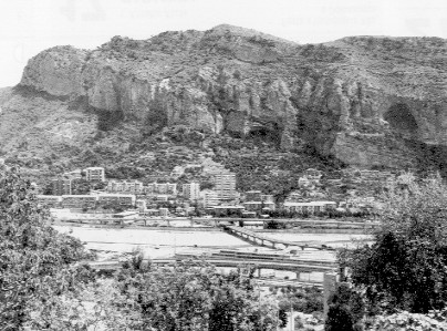 NELL'IMMAGINE UNA VEDUTA DEL POPOLOSO QUARTIERE DI ROVERINO CHE SI VEDE SOTTOSTANTE IL GIGANTESCO COMPLESSO DI ROCCE DI PUDDINGA QUATERNARIA (RIPR. DA CALENDARIO 2002 - ARCHIVIO DI IMMAGINI VENTIMIGLIESI - EDITO E DISTRIBUITO DALLA "CROCE VERDE DI VENTIMIGLIA")