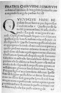 NELL'IMMAGINE SOPRA PROPOSTA SI VEDE L'INCIPIT DELL'INCUNABOLO DEL 1490 INTITOLATO FRATRIS CHERUBINI MINORUM ORDINIS [FRA DA SPOLETO, CHERUBINO] AD IACOBUM DE BONGIANIS SPIRITUALIS VITE COMPENDIOSA REGULA QUAEDAM HOC EST E CHE RISULTA UNITO AL VITE MATRIMONIALIS REGULA [AL COLOPHON] IMPRESSUM HOC EST OPUS FLORENTIAE (...) DIE ULTIMA SEPTEMBRIS MCCCCLXXXX: E' UN LAVORO IN 8° PICCOLO, CC.82, CARATTERE ROMANO, 26 LINEE A CARTA.