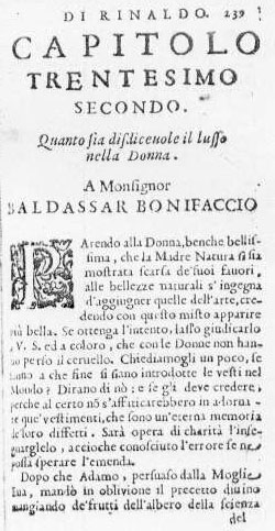 NELL' IMMAGINE SOPRA PROPOSTA SI VEDE LA PAGINA INIZIALE DI UN CAPITOLO (QUI DI SEGUITO PROPOSTO AGLI STUDIOSI NELLA SUA INTEREZZA) DELLO SCUDO DI RINALDO CHE L'ERUDITO E POLIGRAFO ANGELICO APROSIO DEDICO' AVVERSO GLI ECCESSI DEL "LUSSO DONNESCO" DEL SUO SECOLO: PER QUANTO LA DISCUSSIONE SIA ENFATIZZATA DA GIOCHI LINGUISTICI BAROCCHI E TORMENTATA DA UN'EVIDENTE POSTAZIONE MASCHILISTA AVVERSO LE DONNE ESSA COSTITUISCE PUR SEMPRE UN DOCUMENTO INTERESSANTE SIA PER INTENDERE UN CERTO METRO DI VALUTAZIONE DELLA FEMMINILITA' BAROCCA SIA PER ENTRARE UN PO' PIU' DIRETTAMENTE NEL VARIEGATO MONDO DI CERTE ESASPERAZIONI ESTETIZZANTI DELL'EPOCA