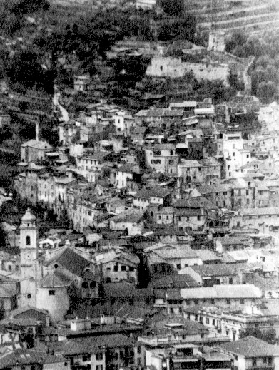 NELL'IMMAGINE, QUI RIPRODOTTA E TRATTA DA UN VOLUME DI N. CALVINI (P.377) SI PUO' AMMIRARE IL COMPLESSO STORICO DI TAGGIA: IN PARTICOLARE, PROCEDENDO DAL BASSO, SI INDIVIDUA LA FABBRICA DELLA "CHIESA DI SANTA LUCIA": PER VISUALIZZARNE TOPOGRAFICAMENTE LA POSITURA SI PUO' "CLICCARE" SUL NUMERO ATTIVO 24 DI QUESTA CARTA DEL XVII SECOLO.