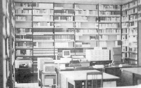UNA SALA INTERNA DELLA BIBLIOTECA CON SCHEDARI E STRUMENTAZIONE INFORMATICA