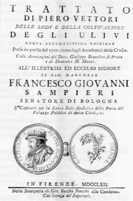 SI TRATTA DEL FRONTESPIZIO DELL'EDIZIONE ORIGINALE DEL VETTORI, DATATA 1762, CON CUI SI DANNO I PRIMI CONTRIBUTI VERAMENTE RAZIONALI E SCIENTIFICI SULL'OLIVICOLTURA