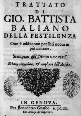 NELLA SOPRA RIPRODOTTA IMMAGINE SI VEDE IL FRONTESPIZIO (CUI SEGUE IL TESTO INTEGRALE) DEL TRATTATO DELLA PESTILENZA/ OVE SI ADDUCONO PENSIERI NUOVI IN PIU' MATERIE REDATTO DA GIOVAN BATTISTA BALIANI (BALIANO).