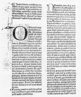 Custodito in biblioteca privata ecco una PAGINA del rarissimo incunabolo, vero e proprio manuale del CONFESSORE, opera di Antoninus Florentinus (Sanctus) dal titolo Incipit sumula confessionis utilissima: in qua agutur quomo se here debeat confessor erga penitente in confessionibus audiendis... edito a Venezia per Johannes de Colonia & Johannes Manthen nel 1474.