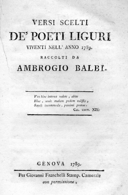 In questa sua ANTOLOGIA di fine XVIII secolo l'erudito Ambrogio Balbi offrì ai lettori ed agli studiosi il quadro nazionale della CULTURA DEL DOMINIO LIGURE DI GENOVA, un'opera significativa in cui letteratura ed arte finirono per essere l'amalgama in cui si riconosceva per la prima volta la ligusticità. L'autore della silloge ritenne peraltro di motivare sia le sue scelte poetiche quanto le ragioni di tali opzioni come si può facilmente evincere dall'INDICE dell'OPERA qui di seguito elensato con l'indicazione non solo delle pagine ma anche la riproduzione dell'apparato biografico pur succintamente riprodotto dallo stesso curatore: