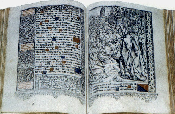 L'immagine riproduce due pagine delle splendide Horae divae Virginis Mariae: volume conservato alla biblioteca Aprosana, in pergamena (Parigi, per Thielmann Kerver, 1505) con decorazioni in minio ed oro. Si tratta di uno dei Libri d'ore o di preghiera (derivati dal breviario ma d'uso privato in cui sono il calendario, l'Ufficio della Vergine, dei morti e dei Santi) che hanno un grande valore specie se usciti dalle botteghe lombarde o francesi (come questo) fra XIV secolo e primi del cinquecemto