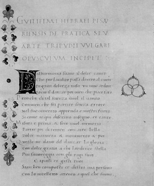 Prezioso manoscritto (Bibliot. Nazionale di Parigi) del "De pratica seu arte tripudii vulgare opusculum" (ovvero "Trattato in volgare sull'arte della danza") opera di Guglielmo Ebreo (1463). Assieme alle opere consimili di Domenico Da Piacenza e Antonio Cornazano è quella di Guglielmo Ebreo che, verso il XV secolo, contribuisce a trasformare le manifestazioni spontanee del ballo in un'arte nuova e nell'emblema non soltanto dei valori spirituali e morali dell'epoca quanto anche della "nuova cultura" dell'uomo umanista e rinascimentale, una cultura che -col contributo non indifferente dell'arte del ballo- mira all'armoniosa conquista di sempre superiori livelli di pensamento ed equilibrio interiore