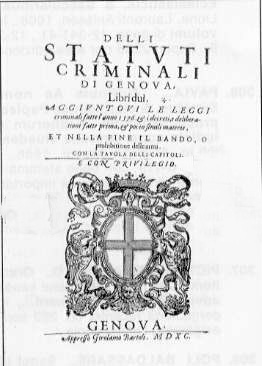 RIPRODUZIONE DA ESEMPLARE DI RACCOLTA PRIVATA: TITOLO DELLI STATUTI CRIMINALI DI GENOVA LIBRI DUI, AGGIUNTOVI LE LEGGI CRIMINALI FATTE L'ANNO 1576 & I DECRETI, E DELIBERATIONI FATTE PRIMA & IN SIMILI MATERIE ET NELLA FINE IL BANDO O PROIBITIONE DELLE ARMI CON LA TAVOLA DELLI CAPITOLI, GENOVA, APPRESSO GIROLAMO BARTOLI, 1590 (VOLUME IN FOLIO DI PP. 16-176-25)