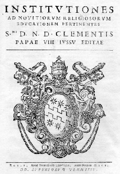 informatizzazione a c. di B. Durante Proveniente dalla Biblioteca privata Durante di Ventimiglia ecco un esemplare delle Institutiones di Clemente VIII del 1601. Esse erano rivolte ai novitii religiosi cioč a quanti accedevano all'esperienza spirituale non dei secolari (regolata dai Vescovi e codificata dai Seminari) ma dei "religiosi" cioč, secondo l' usuale etimologia popolare, di monaci e frati: