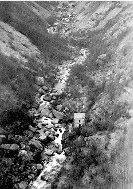 L'IMPRESSIONANTE ABISSO NEI PRESSI DEL PONTE DI LORETO: A FONDOVALLE SI NOTA IL CORSO SUPERIORE DELL'ANTICO "CAPRIOLO", OGGI MEGLIO NOTO CON L'IDRONIMO DI "ARGENTINA", CHE PROPRIO NEI PRESSI DI LORETO SCORRE A VALLE PROFONDAMENTE INCASSATO (FOTO DA ARCHIVIO DE APOLLONIA - VENTIMIGLIA)