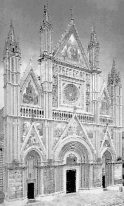 Nella parte inferiore del DUOMO DI ORVIETO, monumento italiano dell'arte gotica [qui sopra la FACCIATA opera di Lorenzo Maitani datata 1310-1330] è espressa una SUMMA della storia sacra: i rilievi che adornano questa sezione del Duomo rappresentano attraverso 4 sezioni -sovrastate dagli emblemi degli Evangelisti- le vicende trattate dalla Genesi, i fatti dei precursori del Messia, alcune fondamentali storie del Nuovo Testamento ed il Giudizio Finale
