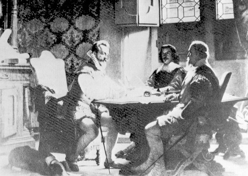 Nella tela del Bellucci si vede il DUCA CARLO EMANUELE I in atto di firmare a Brusolo il trattato di pace con i rappresentanti della Francia. A destra del DUCA sta il CONNESTABILE DI FRANCIA (all'epoca il Lesdiguières) che nel 1625 stipulerà col Piemonte un'alleanza che porterà la Francia ad appoggiare l'invasione sabauda dei territori della Riviera Ligure