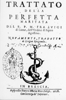 Il frontespizio di uno fra i tanti testi custoditi alla Biblioteca Aprosiana di Ventimiglia in cui implicitamente si danno i parametri epocali del '600 sulla funzione essenziale dell'ESSERE DONNA: quello di risultare una PERFETTA MARITATA cioè una SPOSA ESEMPLARE: cosa che coimplica la capacità di PROCREARE e di ACCUDIRE AI FIGLI necessaria linfa per la vitalità di ogni famiglia e soprattutto di ogni CASATO NOBILIARE o MAGNATIZIO