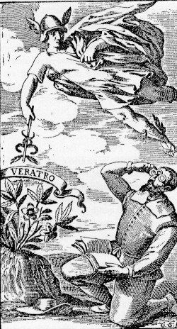 IL FRONTESPIZIO DEL VERATRO IN CUI, PER ALLUDERE ALLA CURA DELLA FOLLIA CHE AVREBBE INVASATO LO STIGLIANI NELLA SUA AGGRESSIONE POLEMICO-LETTERARIA A G.B. MARINO, ANGELICO APROSIO FA ALLUSIVAMENTE CONSIGLIARE DAL DIO MERCURIO UN CESPUGLIO DI ELLEBORO O VERATRO ONDE CURARSI DELLA DEMENZA INTELLETTUALE CHE LO AVREBBE COLPITO PER ESSERSI INTESTARDITO AD ATTACCARE COSI' SEVERAMENTE IL "GENIO LETTERARIO DEL '600 ITALIANO"