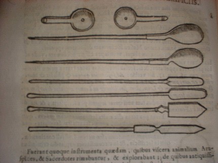 L' antiquario ed erudito GIOVANNI BATTISTA CASALI nel XVII secolo lascị scritto in un suo VOLUME che gli ARUSPICI e i SACERDOTI di ROMA ANTICA si servivano degli STRUMENTI RIPORTATI NELL'IMMAGINE (tratti da una calcografia della sua opera) per scrutare nelle viscere degli animali immolati durante un sacrificio per trarne VATICINIO: di questi STRUMENTI, provenienti dalle sue investigazioni archeologiche, l'autore denunciava la conservazione in un suo privato MUSEO