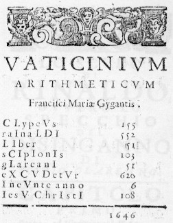 ANGELICO APROSIO HA SEMPRE MANIFESTATO UN INTERESSE NON PEREGRINO SULLA NUMEROLOGIA, la CABALA, LE ESERCITAZIONI LINGUISTICHE COMPLESSE IN CUI PER ESEMPIO INTERAGISSERO NUMERI E LETTERE O MEGLIO OVE DAI NUMERI SI RICAVASSERO LETTERE O VICEVERSA. E' IL CASO QUI DEL VATICINIUM ARITHMETICUM PER LUI REALIZZATO DA FRANCESCO MARIA GIGANTI ED IN CUI LA SEQUENZA DELLE PAROLE CHE COMPONGONO IL TITOLO DI UN'OPERA DEL FRATE APPENA EDITA (LO SCUDO DI RINALDO) OVE A CONCLUSIONE DELLA LETTERA DEDICATORIA APPUNTO SOTTO VOCE DI VATICINIUM ARITHMETICUM COMPARE, COME SI VEDE NELL'IMMAGINE, UN GIOCO SPECULARE TRA UNA SEQUENZA DI NUMERI LA CUI SOMMATORIA PORTERA' AD OTTENERE IL 1646, DATA DI STAMPA DELLO SCUDO. MA ALLA SEQUENZE IN NUMERI ARABI SI PUO' GIUNGERE SOLO DECRITTANDO LA SCRITTURA DI UNA SERIE DI LESSEMI O PAROLE APPARENTEMENTE COLLEGATI PER SEGNALARE ELEMENTI CONTENUTISTICI DEL VOLUME MA IN REALTA' A TAL PUNTO ELABORATI GRAFICAMENTE IN MODO DA FAR EMERGERE (GRAZIE ALLA SCRITTURA IN MAIUSCOLO) LE LETTERE CHE IN LATINO AVEVANO ED HANNO ANCORA VALENZA NUMERICA: ESTRAPOLATE QUESTE LETTERE DAI LESSEMI, TRASFORMATI NUMERI LATINI IN NUMERI ARABI BENE SI INTENDE L'INNOCUO, SCHERZOSO MA SEMPRE SIGNIFICANTE MESSAGGIO APROSIANO