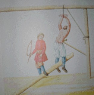 AD ESEMPIO NELLA RUSSIA DEL DISPOTISMO ILLUMINATO DELLA ZARINA ELISABETTA VENNE SOPPRESSA NEL 1744 LA PENA DI MORTE MA SI CONTINUO' AD APPLICARE LEGITTIMAMENTE LA "FUSTIGAZIONE" O "FLAGELLAZIONE" (L'ORIGINALE DELL'IMMAGINE PROPOSTA -PITTURA RUSSA A GUAZZO DI META' '700 - SI CONSERVA A PARIGI PRESSO LA BIBLIOTECA NAZIONALE)