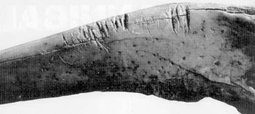Nell'immagine si vedono incisioni su una clavicola di bambino scoperte durante gli scavi nella GROTTA DI FONTBREGOUA NEL VAR : l'ammasso in cui si trovava quest'osso conteneva i resti di sette persone: quattro bambini o adolescenti e tre adulti