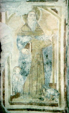L'affresco rappresenta S. ANTONIO ABATE con bastone e bisaccia, gli ATTRIBUTI STORICI DEL PELLEGRINO. Questa iconografia può essere dovuta al fatto che la CHIESA DI S. PIETRO costituiva un PUNTO NODALE PER I VIANDANTI SIA LOCALI SIA CHE ARRIVASSERO DALLA PADANIA SEGUENDO IL TRAGITTO DEL NERVIA: giunge al proposito significativo un atto notarile di metà XIII secolo redatto in S. Pietro con cui un RESIDENTE DELLA VILLA DI CAMPOROSSO dietro compenso affidò ad un esperto cavaliere di fare per lui il temuto viaggio per il SANTUARIO GALIZIANO DI COMPOSTELA portandovi le sue attestazioni di fede e carità. L'analisi della chiesa, agevolata da recenti sondaggi archeologici, ha peraltro consentito di identificare vieppiù quanto si è qui scritto nel TESTO CRITICO sia di disegnare con decente concretezza lo sviluppo architettonico della chiesa. Essa è ad unica ABSIDE a ferro di cavallo e conserva la copertura originaria dell'XI secolo in lastre di pietra arenaria. Il campanile è strutturato a tre ordini di finestre e precisamente due monofore ed una bifora sui lati meridionale e occidentale. All'interno la struttura è a due navate di cui quella centrale segue il perimetro dell'antico edificio risalente all'XI secolo e quindi ampliato con l'aggiunta di una piccola navata laterale tra il '300 ed il '400. Gli affeschi interni vengono distinti in due fasi: la I risalirebbe al XV sec. con la rappresentazione del Cristo benedicente attorniato dalla simbologia dei 4 evangelisti nel catino absidale. Dello stesso periodo sono pure gli affreschi effigianti gli Apostoli con al centro S.Pietro e posti in riquadri all'altezza delle tre monofore dell'abside. E' forse significativo che, all'interno di una chiesa deputata quale punto di incontro dei PELLEGRINI, ai lati dell'ingresso al campanile si trovino le immagini del citato S.ANTONIO ABATE in veste di viandante e del Santo anticamente deputato alla protezione del viandanti (con la rappresentazione, anche sull'esterno delle chiese, per segnalare luoghi topograficamente importanti per i pellegrini) cioè S. CRISTOFORO. Dello stesso sono affreschi che rappresentano alcuni Prelati e Santi secondo lo stile consueto inquadrati nel contesto di partiture geometriche. La seconda fase pittorica risalirebbe invece al pieno XVI sec. e sarebbe contraddistinta dal fregio floreale: a siffatta epoca viene attribuita l'iscrizione dipinta e datata 1575 in memoria del camporossino Nicola Aicardi.