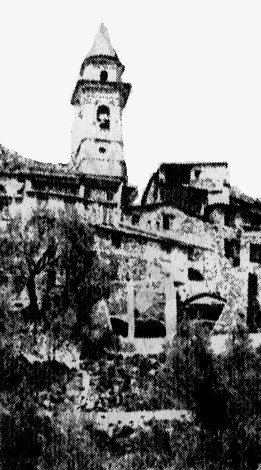 Da un'immagine d'epoca, tratta da archivio privato de Apollonia, una veduta del borgo di GLORI con in primo piano il complesso della chiesa parrocchiale