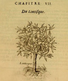Il LENTISCO - che qui si puņ vedere in un'incisione contenuta in un seicentesco VOLUME del POMET) - deriva come fitonimo dal latino lentiscu(m), ed č un piccolo arbusto sempreverde di origine mediterranea del genere PISTACIA (Pistacia lentiscus) tipico della macchia mediterranea, dai cui frutti si estrae un olio aromatico, mentre dal legno si ricava una resina, detta resina mastice.