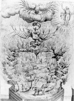 NELL' ALLEGORIA APPARIVA UN DRAGO CHE, EMERGENDO DA UNA SELVA DIABOLICA COSTELLATA DI FUOCHI ED INCENDI, SI LANCIAVA CONTRO LA RELIGIONE IN CUI DIFESA PERO' INTERVENIVA L'AQUILA BIPENNE DELL'IMPERO CHE FACEVA CADERE SUL MOSTRUOSA ESSERE UNA VALANGA DI FUOCO SI' CHE QUESTO "...DOPO UNA GRAN SALVA DI SCOPPI...RUINO' PRECIPITOSO INVERSO L'INFERNO, SUA PROPRIA STANZA"