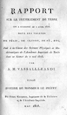 L'IMMAGINE riporta il FRONTESPIZIO (originale custodito presso la "Biblioteca privata Durante") di un VOLUME edito a Torino nel maggio del 1808 ed in cui A.M. Vassalli-Eandi pubblicò una corposa sequenza di osservazioni scientifiche e rilevazioni sperimentali in merito alla forte MANIFESTAZIONE SISMICA che il 2 aprile 1808 colpì il Piemonte e si estese quindi dalle Alpi Marittime alla Provenza, non risparmiando neppure il Ponente ligustico (anche Nizza, Marsiglia, il Ponente ligustico e Genova stessa vennero interessate dal fenomeno): per comodità degli investigatori qui di seguito si ripropongono il RAPPORTO SUL TERREMOTO DEL 2 APRILE 1808, quindi le APPENDICI distinte in OSSERVAZIONI METEREOLOGICHE TRA IL I MAGGIO 1807 ED IL I MAGGIO 1808, in OSSERVAZIONI METEREOLOGICHE DELL'APRILE 1808, in GIORNALE DELLE SCOSSE RIPETUTESI FRA IL 2 APRILE ED IL 12 MAGGIO 1808 ed ancora la dissertazione su FENOMENI E OSSERVAZIONI VARIE