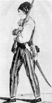 Il SANCULOTTO costituisce certo, una delle figure simboliche del costume rivoluzionario: nella sua "iconografia" risultano pressoché concentrati gli aspetti qualificanti del popolo lavoratore e già storicamente vessato da una sempre più parassita nobiltà. Addirittura nell' origine del nome sono delineati gli elementi portanti del plebeo che risorge dopo secoli d'oblio: il termine sans-culottes, deriva infatti dall'uso di ampi e lunghi pantaloni che favoriscono il lavoro agevole e tutto ciò in piena antitesicon le "aristocratiche" culottes, che obbligavano ad una meccanica educazione gestuale i componenti dei ceti egemoni.