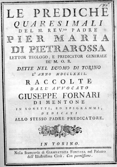 LA SILLOGE DELL'AVVOCATO DI MENTONE ERA COMPOSTA DI 66 SONETTI ED ALTRETTANTI EPIGRAMMI LATINI TRATTANTI LE PREDICHE DEL PADRE PIETRAROSSA SPAZIANTI SUI VARI ARGOMENTI DALLA CARITA', ALL'ESSENZA DELLA FEDE, ALL'IDEALE DEL PREDICATORE, ALLA RELIQUIA DELLA SINDONE ECC.: RIPRODUZIONE DA ESEMPLARE DI BIBLIOTECA PRIVATA DI VENTIMIGLIA