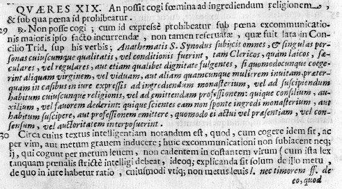 QUI SOPRA SI PUO' SCORRERE IL CAPO PRINCIPALE DEL QUESITO XIX DELL'OPERA DEL PELLIZZARI CIOE' L'INCIPIT DEL QUESITO XIX DEL CAPITOLO II, SEZIONE II, DOVE AL QUESITO FONDAMENTALE "SE SI POSSA COSTRINGERE UNA DONNA AD ENTRARE IN CONVENTO CONTRO LA SUA LIBERA SCELTA COMPARE, CON TUTTE LE INDICAZIONI BIBLIOGRAFICHE, LA RISPOSTA NEGATIVA "NON POSSE COGI, CUM ID EXPRESSE PROHIBEATUR SUB POENA EXCOMMUNICATIONIS MAIORIS