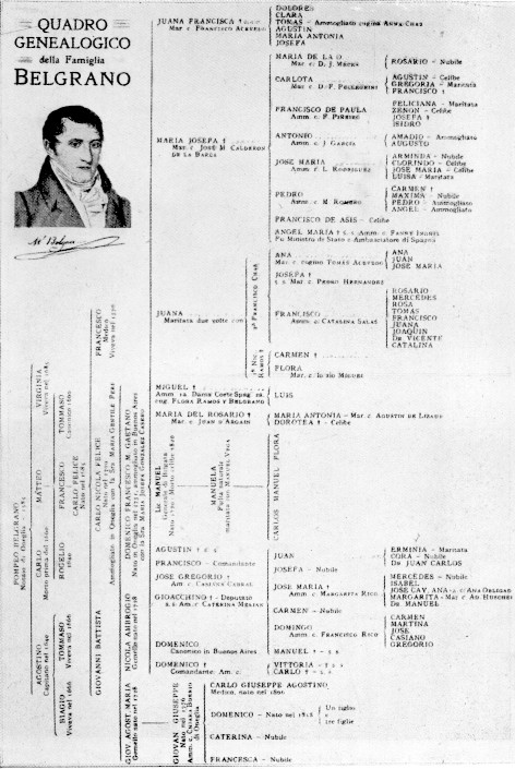 QUADRO GENEALOGICO DELLA FAMIGLIA BELGRANO TRATTA DA N. CUNEO, STORIA DELL'EMIGRAZIONE ITALIANA IN ARGENTINA, 1810-1870, MILANO, 1940 ["MUSEO DELLA CANZONE DI VALLECROSIA (IM)"]