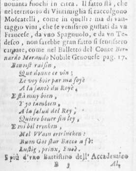 Nell'IMMAGINE è riproposta parte finale della pagina 33 de La Biblioteca Aprosiana. Passatempo autunnale di Cornelio Aspasio Antivigilmi, tra i Vagabondi di Tabbia detto l’Aggirato, Conte Palatino... (Bologna, per li Manolessi, 1673) in cui l'erudito poligrafo ventimigliese Angelico Aprosio riporta stralcio di una composizione poetica di Bernardo Morando in cui viene celebrata (sulla scia di una tradizione diffusa fra i dotti ed in particolare gli scrittori di geografia umana del XVII secolo) la qualità del vino MOSCATELLINO che da metà '500 ai primi decenni del XIX secolo fu una voce importante dell'economia ligure occidentale, essendo molto richiesto tale prodotto e frequentemente esportato sulle varie piazze mercantili da navi salpanti in particolare dai porti di Taggia e di Ventimiglia.
