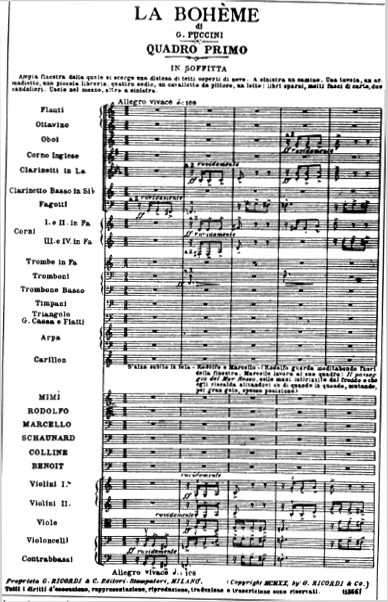 NELL'IMMAGINE UNA UNA PAGINA DE LA BOHEME DI PUCCINI: SUL MARGINE SINISTRO SI PUO' VEDERE L'INDICAZIONE DEGLI STRUMENTI O DELLE VOCI CUI OGNI PENTAGRAMMA SI RIFERISCE (DA ARCHIVIO DEL MUSEO DELLA CANZONE DI VALLECROSIA)