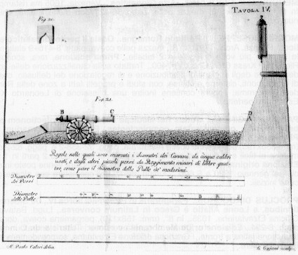 L'INCISIONE è tratta dalla rara edizione originale del volume opera di SILVESTRO VIGNOLO (e pubblicato a Genova, per i tipi di Antonio Casamara, 1701) dal titolo: Il Bombista instruito, cioè Breve instruzione per il Bombista principiante ristretta nelli quattro seguenti trattati., I - Di Geometria prattica., II - Del modo di misurare le distanze con un nuovo stromento senza necessità di conteggiare., III - Della squadratura e direzione del Mortaro mediante due stromenti di una nuova invenzione, co'l modo di valutare li tiri., IV - Dell'aritmetica pratica