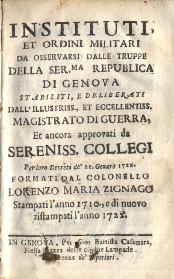 QUI SOPRA, A TESTIMONIANZA DELLE NUOVE ESIGNEZE, SI E' RITENUTO UTILE PER GLI STUDIOSI RIPRODURRE IL FRONTESPIZIO DEGLI STATUTI E/O ORDINAMENTI (DI SEGUITO INTEGRALMENTE RIPRODOTTI E LEGGIBILI IN TRASCRIZIONE ANCHE COMMENTATA) DELL'ESERCITO DI GENOVA ("CLICCA QUI PER ACCEDERE ALL'INDICE DI TALI ORDINAMENTI) REDATTI NEL XVIII SEC. DAL COLONNELLO ZIGNAGO (BIBL. PRIVATA - VENTIMIGLIA)