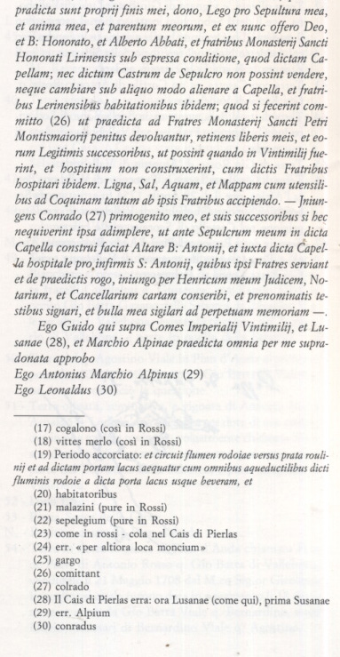 CLAUSOLA DI SALVAGUARDIA (RIGHE 8 E 9 DALL'ALTO) INSERITA NEL SUPPOSTO TESTAMENTO DEL CONTE GUIDO DI VENTIMIGLIA A PRO DELL'ABBAZIA BENEDETTINA DI MONTMAJOUR