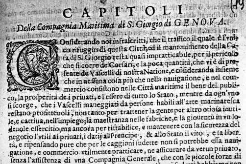 Considerando noi infrascritti, che il traffico, il quale è l'unico rifuggio di questa Città, ed il mantenimento della Casa di S. Giorgio resta quasi impratticabile, per il pericolo che si corre de Corsari, e la poca quantità, che vi è di presente de Vascelli di nostra nazione, e considerando insieme che in nessuna cosa più che nella navigatione, e nel commercio consistono nelle Città marittime il bene del publico, la prosperità de i privati, e l'essere di tutto lo Stato, mentre da ogn'uno si scorge, che i Vascelli maneggiati da persone habili all'arte marinaresca restano profittevoli, non tanto per trattener la gente per altro otiosa inutile, e cattiva, nell'impiego; la maestranza nelle fabriche, e la gioventù in un lodevole essercitio, ma ancora per ristabilire e mantenere con la sicurezza del negotio l'utili ai privati, i datij al Prencipe, & allo Stato il vito, e la libertà, e ripensando pure che per le caggioni sudette non si potrebbe essa navigatione, e commercio utilmente pratticare, ne assicurare da verun privato, senza l'assistenza di una Compagnia Generale, che con le piccole forze di molti possa constituir una forza grande; Perciò noi sudetti habbiamo con maturo consiglio, e per urgente necessità deliberato col favor di Dio, di Nostra Signora e Regina, e de Gloriosi S. Gio. Battista, S. Giorgio, e S. Bernardo, nostri avocati di formare una Compagnia, la quale sotto l'assoluta autorità, e benigna protettione della Repubblica Serenissima, e con l'aiuti dell'Illustriss. Signori Protettori di S. Giorgio possa con fondamenti sodi reggersi, incaminarsi, e provedere a tutto ciò che sarà necessario per la fabrica, e mantenimento delle Navi opportune, per assicurare, e confermare l'essere in Casa, & il traffico in qualsivoglia parte del Mondo, e per goderne in conseguenza tutti gli utili, & impieghi, che da per tutto ne godono le Nationi straniere, si che à questo effetto siamo venuti in parere di stabilire le seguenti Capitulazioni.