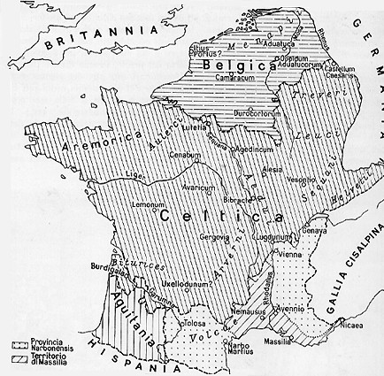 Di questi antagonismi si giovò Roma nella sua conquista delle Gallie. Questa si limitò dapprima alla Gallia compresa tra le Alpi, il Rodano ed il Mediterraneo che costituì la provincia della Gallia Narbonese o, semplicemente, Provincia (donde l'odierno toponimo di Provenza). Successivamente il dominio romano si estese a tutta la Gallia: tale espansione fu realizzata Giulio Cesare (100-44 a. C.) che, sfruttando abilmente le rivalità tra i diversi popoli, aveva acuito la pressione di popoli germanici sul Reno: facendo leva sull'atteggiamento filoromano dell'aristocrazia, tra il 58 ed il 52 a. C. a sottomise tutta la Gallia. I1 tentativo di scatenare una sollevazione dei Galli delle regioni centrali contro la conquista ro