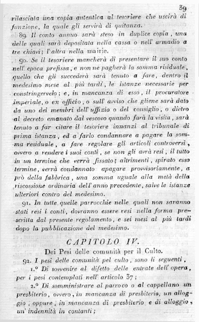 COPIA ITALIANA DEL DOCUMENTO ORIGINALE DEL DECRETO IMPERIALE CONCERNENTE LE FABBRICHE (PROMULGATO NEL "PALAZZO DELLE TUILLERIE, IL DI' 30 DICEMBRE 1810") CON CUI NAPOLEONE BONAPARTE RIORGANIZZO' AMMINISTRATIVAMENTE TUTTA LA STRUTTURA PORTANTE DELLA CHIESA CATTOLICA DEL SUO IMPERO: LA COPIA IN OGGETTO FU STAMPATA IN REDAZIONE BILINGUE (FRANCESE ED ITALIANA) DALLO STAMPATORE DI CUNEO PIETRO ROSSI NELL'ANNO 1811