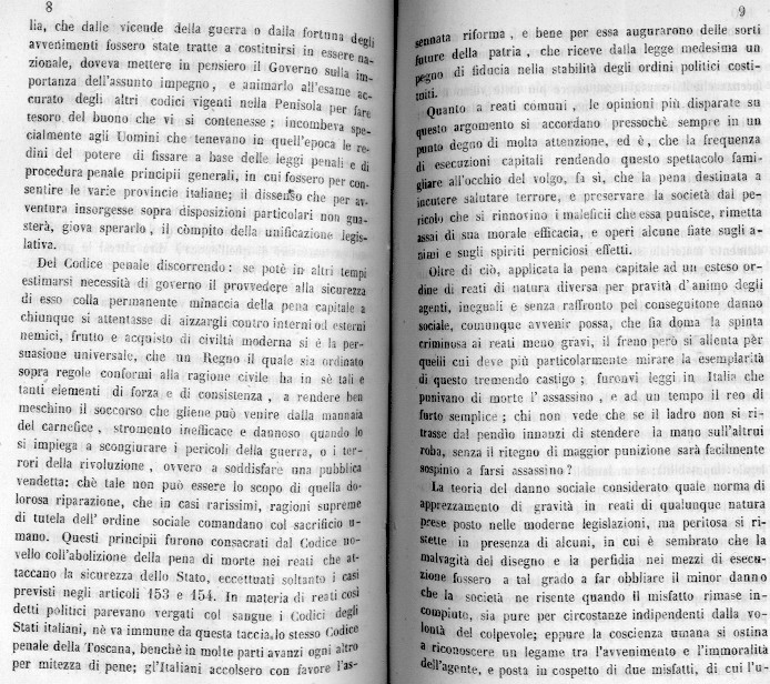 E' PERALTRO SIGNIFICATIVO CHE LO STESSO TESTO OTTOCENTESCO SOPRA PROPOSTO (PRESCINDENDO DAI VARI DISTINGUO CONNESSI AI PICCOLISSIMI STATI DELL'ANTICO REGIME, DAGLI EFFETTI DELLA DOMINAZIONE NAPOLEONICA E DALL'EVOLUZIONE PROGRESSIVA IN CAMPO DI DIRITTO CRIMINALE) CITI ESPRESSAMENTE L'ESIGENZA DI UNIFORMARE I QUATTRO CODICI PENALI DELL'ITALIA PREUNITARIA E SPECIFICATAMENTE QUELLO DEGLI "STATI" PRINCIPALI USCITI DALLE PREFIGURAZIONI DIPLOMATICHE AUSTRIACANTI DEL CONGRESSO DI VIENNA DEL 1815, VALE A DIRE IL CODICE PENALE DELLA TOSCANA QUELLO DEL REGNO DI NAPOLI, NATURALMENTE QUELLO DEL REGNO SABAUDO ED INFINE QUELLO DEGLI ANTICHI DOMINI AUSTRIACI.