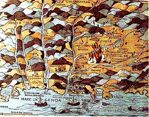 NIZZA e LIGURIA, TERREMOTO = disegno portato da mercanti tedeschi, probabilmente ripreso da originale italiano, rappresentante gli effetti del terremoto del luglio 1564 sul territorio (Erlagen): fonte Capurro