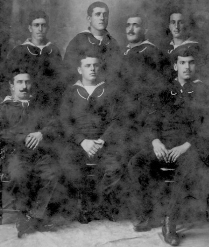 GIOVANNI AURELIO TRAVERSO (SESTRI PONENTE 1890 - GENOVA VOLTRI 1982) E' IL SECONDO IN PIEDI DA SINISTRA, PER CHI GUARDA: LA FOTOGRAFIA FU SCATTATA PRESSO UN FOTOGRAFO DI NAPOLI DA UN GRUPPO DI MARINAI DELLA FLOTTA REALE IN PROCINTO DI SALPARE ALLA VOLTA DEL CONFLITTO ITALO-TURCO PER IL POSSESSO DELLA LIBIA: NEL PROSEGUIMENTO DELLA GUERRA LA NAVE DA BATTAGLIA SU CUI ERA IMBARCATO GIOVANNI AURELIO TRAVERSO SI PORTO' CON ALTRE UNITA' AD ATTACCARE IL DODECANNESO E LE FORZE ITALIANE PRESERO QUARTIERE NELLE ISOLE DELL'EGEO.
