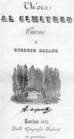 NELL' IMMAGINE SOPRA PROPOSTA SI VEDE IL FRONTESPIZIO DI UN POETICO CARME (QUI INTERAMENTE RIPROPOSTO NELL'ORIGINALE) COMPOSTO DAL POLITICO MODERATO, MEMORIALISTA E STORICO SABAUDO GIORGIO BRIANO CHE INDUBBIAMENTE HA COMPOSTO QUESTO SUO GIOVANILE E MISCONOSCIUTO LAVORO SOTTO LA SUGGESTIONE DEL CAPOLAVORO FOSCOLIANO DEL DEI SEPOLCRI MA CHE PARIMENTI NON HA MANCATO DI AFFRONTARE ALTRE TEMATICHE: DA QUELLA, CHIARAMENTE PERCEBIBILE, DEI CONTENUTI ADDIRITTURA PROTOROMANTICI DELLA LIRICA CIMITERIALE, A QUELLA (ESTESAMENTE TRATTATA) DEL TEMA DELLA MORTE E DELL'OBLIO DELLE GENERAZIONI, A QUELLA ANCORA DELLA CIVILE CONDANNA DELLA COSTUMANZA GIURIDICA PENALE DEL SUPPLIZIO ESTREMO SUL PATIBOLO CHE PARE SUGGERITA DA UNA QUALCHE EMOTIVA RELAZIONE CON GLI EVENTI POLITICI CHE INSANGUINARONO PIEMONTE E LIGURIA PROPRIO NEL 1833 COI SANGUINOSI EVENTI CONNESSI ALLA REPRESSIONE DEI MOTI MAZZINIANI