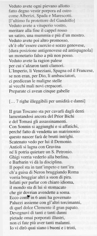 TRATTO DAL SAGGIO DI B. DURANTE DAL TITOLO BIBLIOTECA APROSIANA, DIBATTITI ERUDITI E PROGETTAZIONI ACCADEMICHE FRA 1600 - 1700 IN "APROSIANA - RIVISTA ANNUALE DI STUDI BAROCCHI", NUOVA SERIE, ANNO VIII, 2000 = SI RIPRODUCE DEL SAGGIO L'APPENDICE (PP. 66 - 70) CHE E' IL COMMENTO E LA TRASCRIZIONE DELLE RIFLESSIONI DI PASQUINO FATTE SOPRA L'ELEZIONE DEL FUTURO PONTEFICE (ORIGINALE IN MANOSCRITTO 40 DELLA C.B.A.)