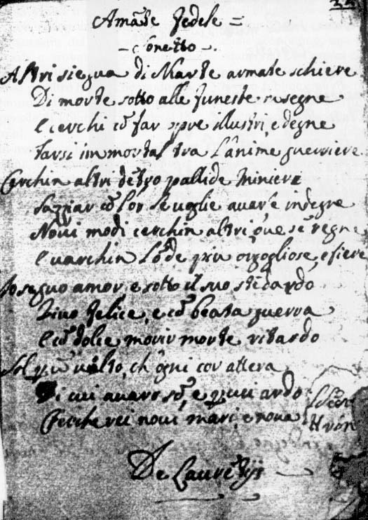 AMANTE FEDELE SONETTO DI P. 24 DEL MANOSCRITTO: SI NOTI ALLA FINE LA FIRME LATINEGGIANTE DI UN DE LORENZI