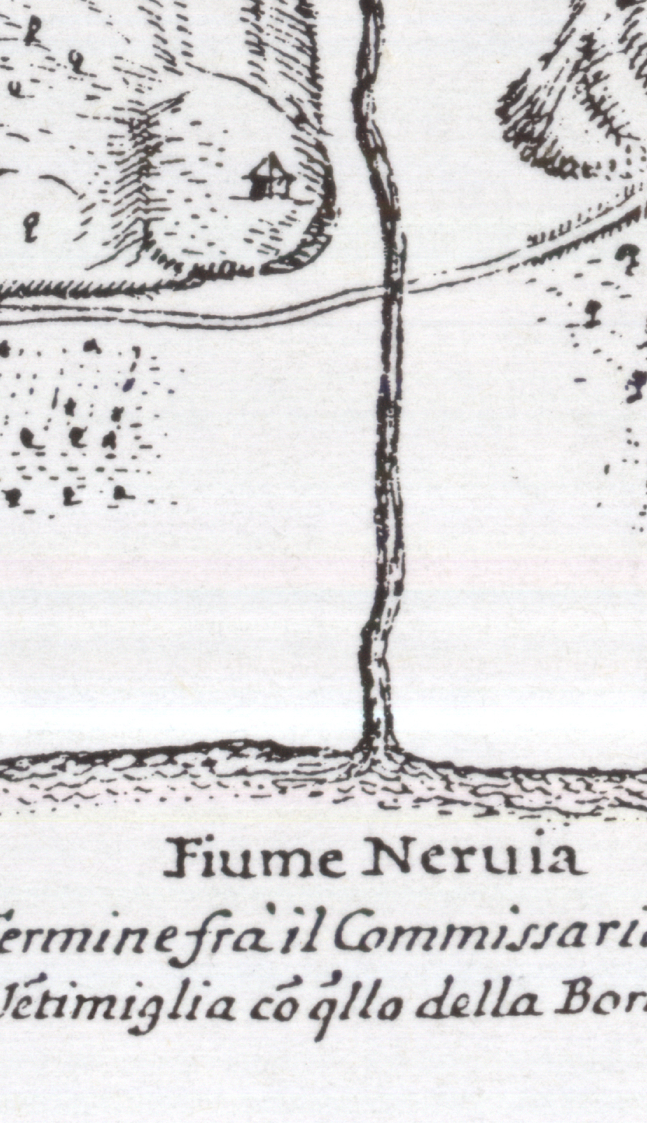 (Titolo posto a tergo sulla scheda d'archivio). Nell'angolo inferiore di destra è disegnato un cippo, sormontato da un grifone tenente un drappo spiegato, sul quale sta scritto, in caratteri capitali: "Commissariato della Bordighera". Inquadrato sopra il lato apparente del cippo vedesi un disegno, raffigurante una parte della città di Bordighera, cinta di mura, con cavaliere ed altre figurine fuori delle mura stesse. È senza data e sottoscrizione, ma, dai caratteri del disegno e dal confronto colla carta riguardante la pianta di Pieve di Teco di M. Vinzoni (Pieve 1), si può attribuire, senza tema di errare, allo stesso Vinzoni, e all'anno 1730 circa. Consta di un sol foglio che misura, nei limiti del contorno, cm. 63,5 in lunghezza e 43,5 in altezza. È disegnata a penna, senza colorazione, ma con tratto finissimo. Scala di palmi di Grenova 5.000 = mm. 113. A tergo, sulla scheda d'archivio, scala numerica di 1:10.800. Orientazione a gradi 22. Abbraccia la circoscrizione del Commissariato di Sanità di Bordighera, ossia la costa dal fiume Nervia (termine del Commissariato di Bordighera con quello di Ventimiglia) fino al ponte della Liscia (termine del Commissariato di Bordighera con quello di S. Remo), ed in più la spiaggia di Ospidaletto con questa località. Sono segnati, a tratteggio, i monti lungo la costa, senza enunciazione dei loro nomi, ed indicati i vari fiumi o torrenti che ne scendono al mare, alle foci dei quali si leggono i nomi delle rispettive vallate: Nervia, Vallone di Valle Crosa, Vallone di Borghetto. Sono indicate: la località di Bordighera, cinta di mura, con pianta geometrica pentagonale e panoramica su pezzette di carta mobile sovrapposto; la spiaggia di Arsilla; la punta di Migliarese; la Cala di N. Signora della Rota; la spiaggia del Gionchetto; il ponte della Liscia; la spiaggia e la località di Ospidaletto. - Nell'interno vedonsi nominati soltanto S. Vicenzo (in Valle Crosia), Nostra Signora del Loreto e Nostra Signora dei miseri sordi (nel vallone di Borghetto). Il terreno è quasi tutto alberato. Lungo la costa si vedono, a distanze regolari, delle casette isolate ed una torre (questa presso la spiaggia di Valle Crosa), evidentemente per il servizio degli agenti del Commissariato suddetto. Lungo la costa medesima sono messi bene in rilievo i tratti di scogliera e le spiaggie. Si vede nettamente tracciato il percorso della strada costiera, la quale tocca le località di S. Vicenzo, Nostra Signora di Loreto, Nostra Signora dei miseri sordi, e Nostra Signora della Rota. Nel mare si vedono, finemente disegnati, un liuto ed un gozzo. Il disegno di questa carta è così accurato che, alla prima impressione, si direbbe incisa in legno. L'angolo superiore di sinistra è occupato da una cartina panoramica, a scala ridotta (di cm. 23,5x17,5), del territorio dello stesso Commissariato e di quello di Ventimiglia, coi relativi confini a monte. Vi sono segnati a tratteggio i monti; inoltre, i valloni, come nella carta principale, e, in più, il fiume Roja fino a Breglio, col suo affluente Bèvera sin oltre il confine cogli Stati del Rè di Sardegna. Con gruppi di case e campanile si vedono rappresentate le seguenti località (da E. ad W.): Ospidaletto. Bordighera, Seborca (colla linea di confine del suo territorio), Sasso, Valle Bona, Borghetto, Valle Crosa, Soldano, S. Biagio, Perinaldo, Apricale, Dolceacqua, Campo Rosso, Abeglio, Airole, S. Michele, Fanghetto, Penna, Breglio e Olivetta. Stato di conservazione: buono.
