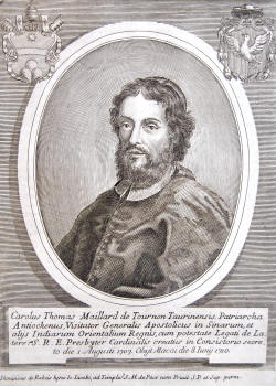 Carlo Tommaso Maillard de Tournon, in lingua cinese Duo lè (Torino, 21 dicembre 1668 – Macao, 8 giugno 1710), è stato un cardinale e patriarca cattolico italiano. Fu legato pontificio per l'India e la Cina. Nato da nobile famiglia a Torino il 21 dicembre 1668, dopo la laurea in teologia (28 agosto 1688) presso l'Università di Nizza (Savoia) ed in diritto canonico e civile (23 gennaio 1690), fu ordinato presbitero il 12 giugno 1695. Si trasferì quindi a Roma, ove figura tra i fondatori dell'Accademia dell'Arcadia a Roma, nel 1690. In questo periodo fu anche uditore e rappresentante in Roma del cardinale Baldassarre Cenci, divenuto arcivescovo di Fermo. A Roma ottenne la stima di Clemente XI, che il 5 dicembre 1701 lo nominò legato a latere per l'India e la Cina. Il 27 dicembre 1701, Tournon fu consacrato vescovo dal papa nella Basilica Vaticana, con il titolo di Patriarca di Antiochia. Scopo di questa legazione era quello di ristabilire l'armonia tra i missionari e provvedere ai bisogni di queste missioni, riferendo alla Santa Sede sulla situazione generale delle missioni, nonché istituire un Superiore di tutti i missionari; ma soprattutto era quello di pubblicare le decisioni della Santa Sede in materia di riti cinesi, ufficializzate nel Decreto Cum Deus Optimus del 20 novembre 1704, e di farle rispettare dai missionari di Cina. Questi riti consistevano essenzialmente nella partecipazione alle cerimonie periodiche di omaggio a Confucio, in certe modalità del culto degli antenati, e nell'uso dei termini cinesi Tian (Cielo) e Shàngdi (Signore supremo), per indicare il Dio dei cristiani, generalmente indicato con il termine Tianzhu. Le decisioni prese dalla Curia romana erano generalmente contrarie a tollerare che i cinesi che abbracciavano la fede cristiana continuassero a seguire quelle pratiche. Il legato lasciò l'Europa sulla nave francese Maurepas il 9 febbraio 1703, arrivando a Pondichery in India, il 6 novembre 1703; lì emanò un decreto, in data 23 giugno 1704, per vietare ai missionari alcune pratiche para-religiose tradizionalmente in uso nella regione, chiamati convenzionalmente "Riti malabarici"; il decreto proibiva tra l'altro ai missionari di celebrare matrimoni tra bambini, pratica molto seguita in India. L'11 luglio 1704 partì da Pondicherry per la Cina, facendo sosta a Manila, nelle Isole Filippine. Arrivò a Macao il 2 aprile 1705 e a Pechino il 4 dicembre successivo. L'imperatore Kangxi in un primo momento lo accolse benevolmente, ma dopo alcune udienze, si rese conto che Tournon era venuto per nominare o divenire egli stesso superiore dei missionari in Cina, con lo scopo di far rispettare i decreti papali in materia di "riti cinesi", ed allora le loro relazioni si raffreddarono e la legazione si avviò verso il fallimento. A dicembre 1706 Kangxi emise un Decreto per imporre a tutti i missionari una autorizzazione imperiale ("Piao") per poter rimanere in Cina e praticare la religione cristiana, pena l'espulsione immediata. Tournon, dopo che nel gennaio 1710 era stato raggiunto da alcuni missionari (Gennaro Amodei, Giuseppe Cerù, Guglielmo Fabre-Bonjour, Teodorico Pedrini, Domenico Perroni e Matteo Ripa) che gli portavano la nomina cardinalizia decisa dal Concistoro del 1º agosto 1707, morì, in regime di restrizione di libertà, l'8 giugno 1710. Fu sepolto a Macao, ma la sua salma fu riportata a Roma dal secondo legato papale Carlo Ambrogio Mezzabarba, per essere collocata nella chiesa di Propaganda Fide (la Chiesa dei Re Magi), il 27 settembre 1723, ove si trova ancora una grande lapide in ricordo del Patriarca. A Torino, nella chiesa di Sant'Agostino, gli è stato dedicato un Mausoleo, opera del Tantardini. La notizia della morte di Tournon provocò una forte impressione a Roma: Clemente XI lo elogiò in pubblico ed in privato per il suo coraggio e per la fedeltà alla Santa Sede. Il Sant'Uffizio emise un decreto (25 settembre 1710) che rigettava i ricorsi, confermava gli atti del legato e condannava ancora una volta i Riti Cinesi. Molti anni dopo la morte del Cardinale Tournon fu pubblicata una corposa raccolta di tutti gli scritti suoi e dei missionari che collaborarono con lui nel corso della Legazione; la pubblicazione dell'opera Memorie Storiche, in otto volumetti, fu curata dal cardinale Passionei nel 1761 ed ebbe un notevole ruolo nel contesto delle polemiche anti-gesuite che prepararono il terreno per la chiusura della Compagnia, avvenuta nel 1773. Bibliografia = Memorie storiche della legazione e morte dell'eminentiss. Monsignor cardinale di Tournon esposte con munumenti rari ed autentici non più dati alla luce, (attribuite al cardinale Domenico Passionei), Venezia, 1761-1762, in 8 volumi Giorgio Dell'Oro, Oh quanti mostri si trovano in questo nuovo mondo venuti d'Europa: vita e vicissitudini di un ecclesiastico piemontese tra Roma e Cina: Carlo Tommaso Maillard de Tournon 1668-1710, in Annali di storia moderna e contemporanea, 1998, anno IV, n. 4 Michael Ott, Charles-Thomas Maillard De Tournon, in The Catholic Encyclopedia, Vol. 15, New York, 1912 Giacomo Di Fiore, Voce "Maillard de Tournon, Carlo Tommaso" in Dizionario Biografico degli Italiani, Vol. 67, ediz. Istituto Treccani, Roma, 2007 Francis A. Rouleau, S.J., Maillard de Tournon Papal Legate at the Court of Peking, in Archivum Historicum Societatis Iesu, Vol. XXXI, Romae, Institutum Historicum S. J., 1962 Robert C. Jenkins , The Jesuits in China, David Nutt, London 1894