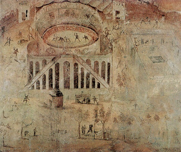 Nell'immagine sopra riprodotta (custodita A NAPOLI, MUSEO ARCHEOLOGICO NAZIONALE) è pittoricamente effigiata, proveniente da una pittura muraria di un'ABITAZIONE POMPEIANA, la rappresentazione che un committente privato volle per rammentare un grave evento che avvenne nell'ANFITEATRO DI POMPEI durante l'anno 59 d.C. e che fu ricordato dallo storico Tacito: si trattò di una sanguinosa rissa fra tifosi di fazioni contrapposte (cittadini di POMPEI e NOCERA) che pur di sostenere i propri ATLETI non si astennero dalla violenza: l'imperatore NERONE che pure fu un ESTREMO SOSTENITORE dei LUDI O GIOCHI CIRCENSI interdì ai Pompeiani i giochi per 10 anni, anche se non potè impedire che questi si vantassero di aver sopraffatto i Nocerini addirittura con delle occasionali scritte sui muri della città (ALBINTIMILIUM..., p.137, nota 104.