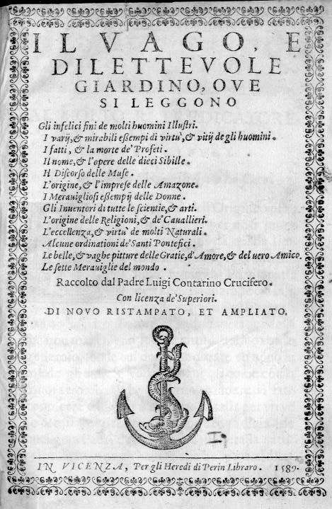 L. CONTARINI, Il vago , e dilettevole giardino..., in Vicenza, per gli Eredi di Perin Libraro, 1589, cui è spesso allegata una Aggiunta del 1590 per lo stesso stampatore: esemplare da raccolta libraria privata.