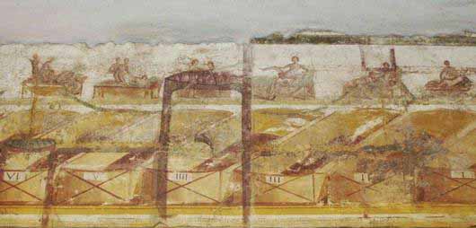 Bighe e quadrighe sono il soggetto di un altro gruppo di tessere. In un caso una biga con ruota a quattro raggi è guidata da un auriga con lungo ramo di palma nella mano destra, mentre con la mano sinistra regge le redini. I cavalli sono al galoppo e sollevano le zampe anteriori. Il suolo è indicato con una linea.